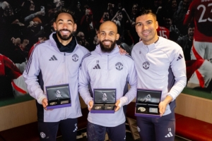 体育资讯2月28日讯 曼联官方晒出卡塞米罗、库尼亚、姆伯莫三人合照,赠送纪念奖牌,纪念三人在英超的里程碑时刻。