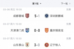 此外,天津津门虎首轮与重庆铜梁龙互交白卷,获得了1分。首轮比赛中输球的负分球队有3支,分别为青岛海牛、上海海港、武汉三镇。